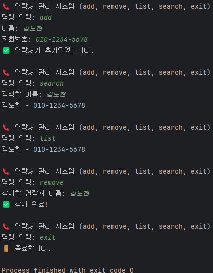 - 연락처 정렬 기능: 현재 list 기능은 단순히 추가된 순서대로 출력됩니다. 이름 오름차순으로 정렬하여 출력하도록 Comparator와 Collections.sort() 또는 스트림의 sorted()를 활용해볼 수 있습니다.