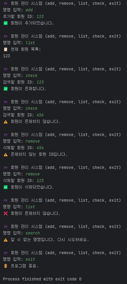 System.out.println("\n\uD83D\uDC65 회원 관리 시스템 (add, remove, list, check, exit)");